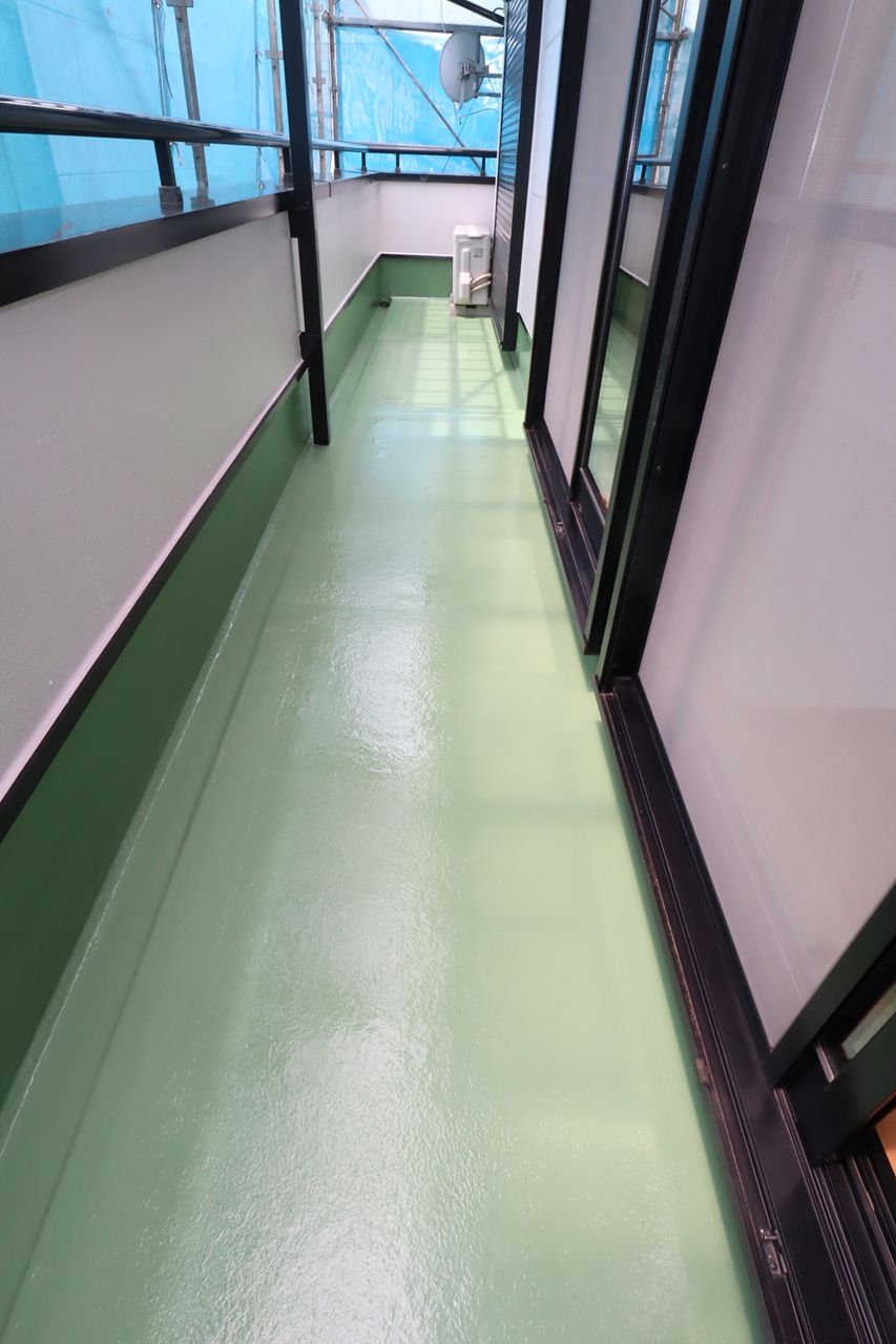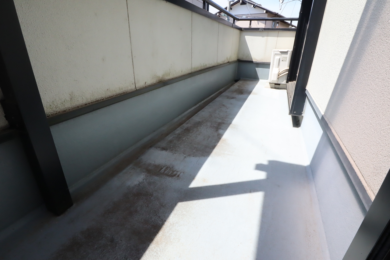 ベランダの塗装、外壁面・屋根の高圧洗浄・塗装、雨樋や軒天井の塗装を行いました。