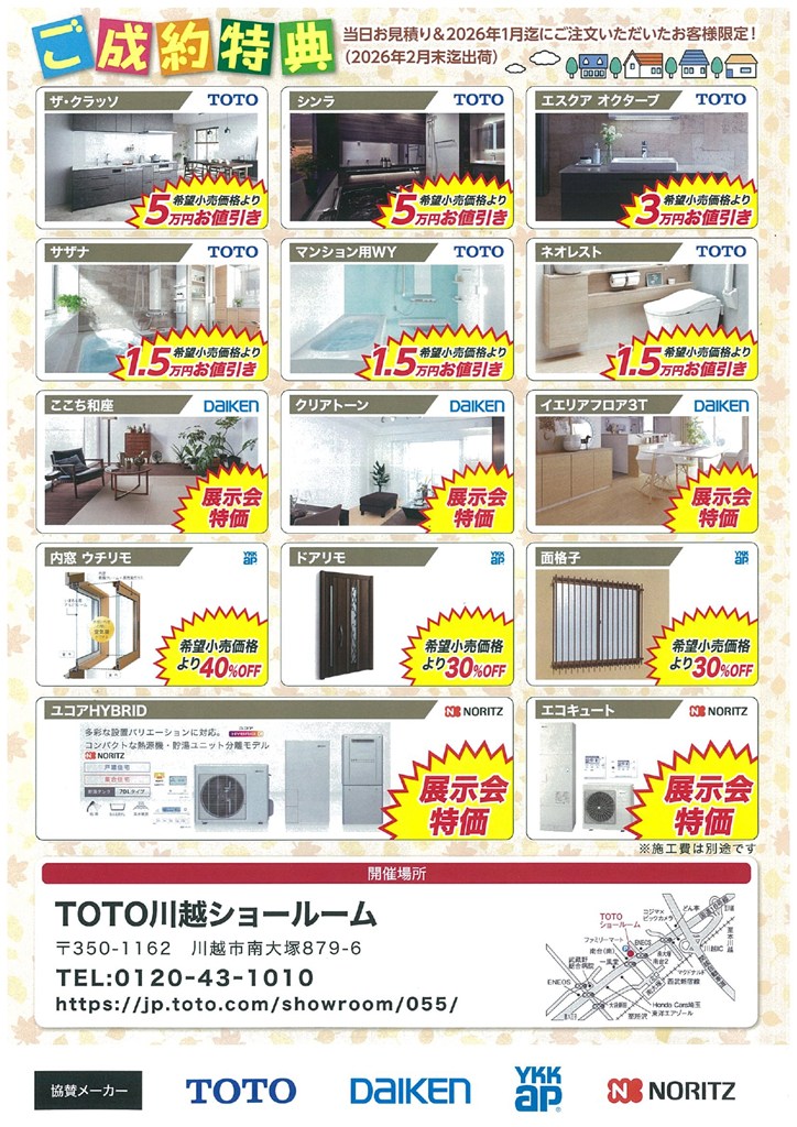 期間中にショールームご来場・お見積りの上ご成約いただいたお客様へ、特別割引価格で商品をご購入いただける特典等をご用意しております。