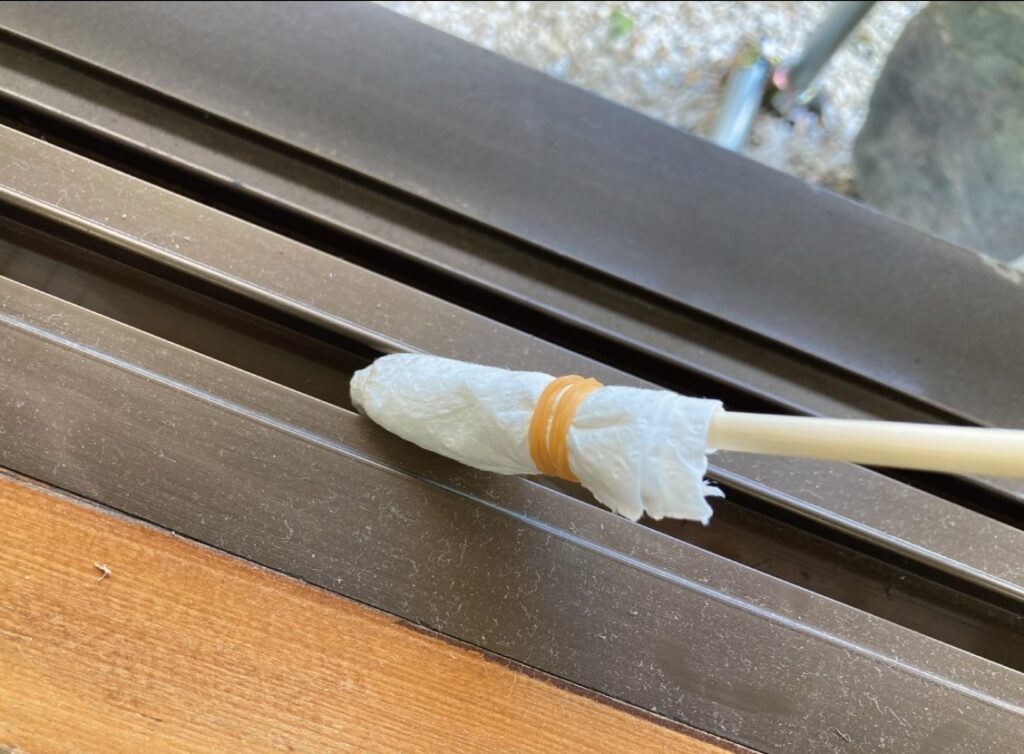 サッシは割りばし等棒状のものにキッチンペーパーや薄手のタオルを巻き付けて汚れを拭き取ります。