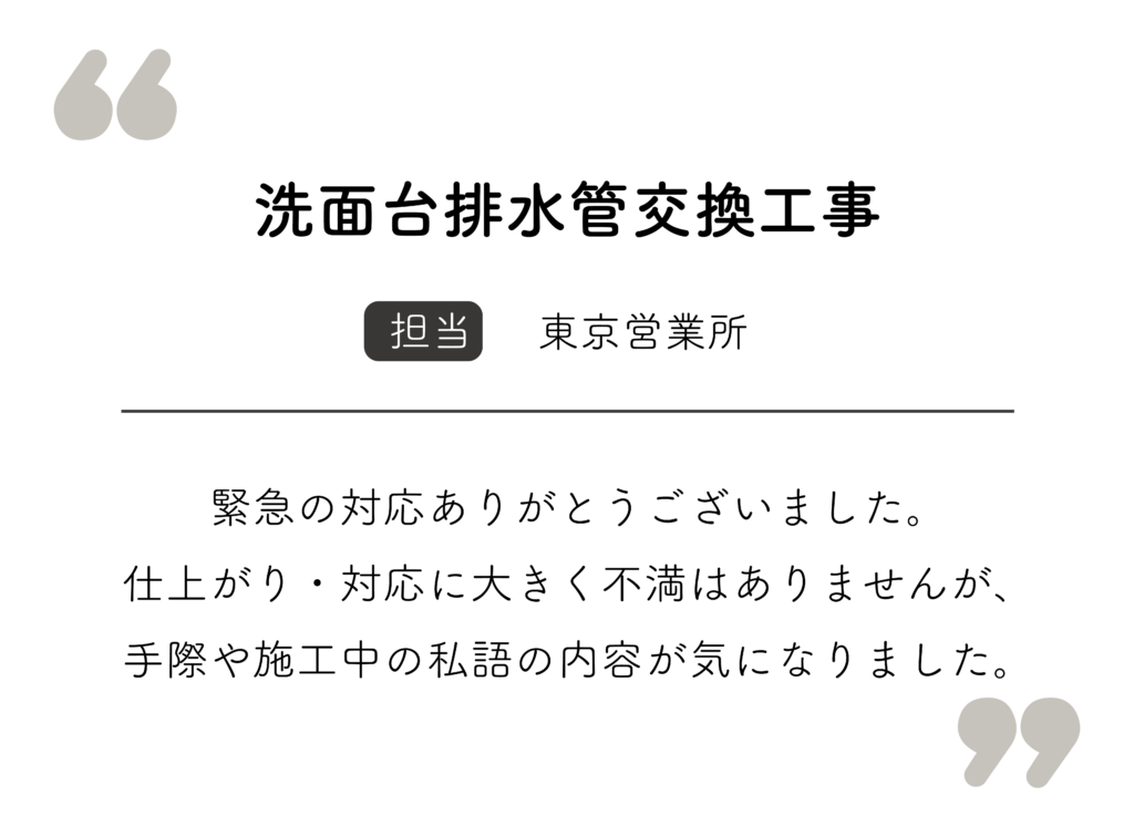 施工中の言動や準備不足によりご不快な思いをさせてしまいましたこと、お詫び申し上げます。